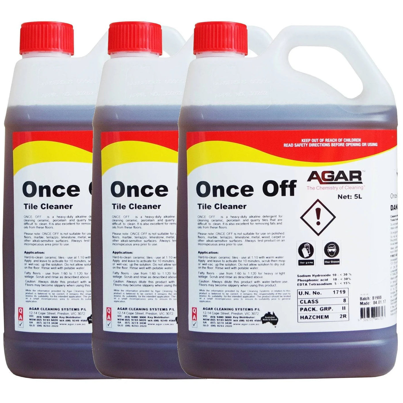 Agar Once Off is a superior strength, heavy-duty alkaline tile cleaner specially formulated to remove stubborn, ingrained dirt from ceramic, porcelain, and quarry tiles that are difficult to clean. It deeply penetrates porous surfaces, drawing out dirt trapped in tiny holes and pores that ordinary detergents cannot reach. Suitable for periodic restorational cleaning, it is designed for use in high-traffic areas such as shopping centres, toilets, shower rooms, kitchens, and car parks.